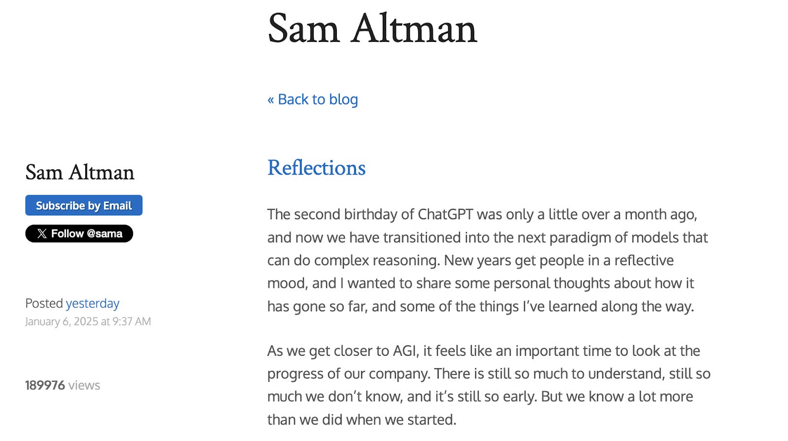 1/6 ,Sam Altman 在個人 Blog 上發佈的文章 Reflections(反思)。以個人以及 OpenAI CEO 的角度,回顧 ChatGPT 發佈兩年以來的經歷與故事。