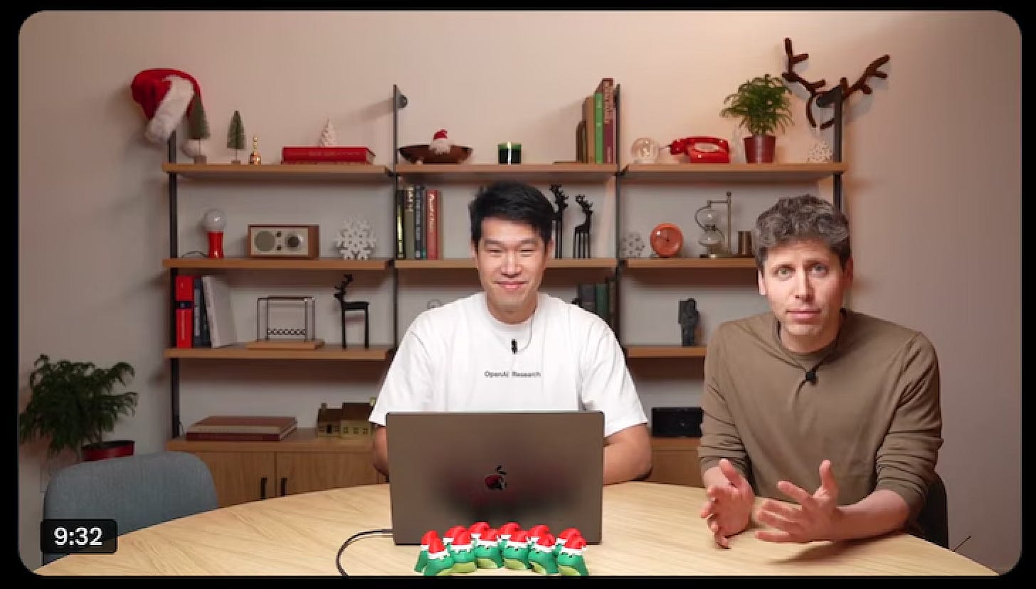 從 12/5 起,以 Sam Altman 為主,連同其他多位 OpenAI 高管,以預錄直播影片的形式,展開為期 12 天、每天一次的產品發佈會 12 Days of OpenAI。在這篇文章中,我不會討論太多關於 AI 的現況與發展,因為過去這一個月來,不論在各類媒體或是各種社群平台上,已經有太多精彩的討論與評論(當然,也戰得很兇)。