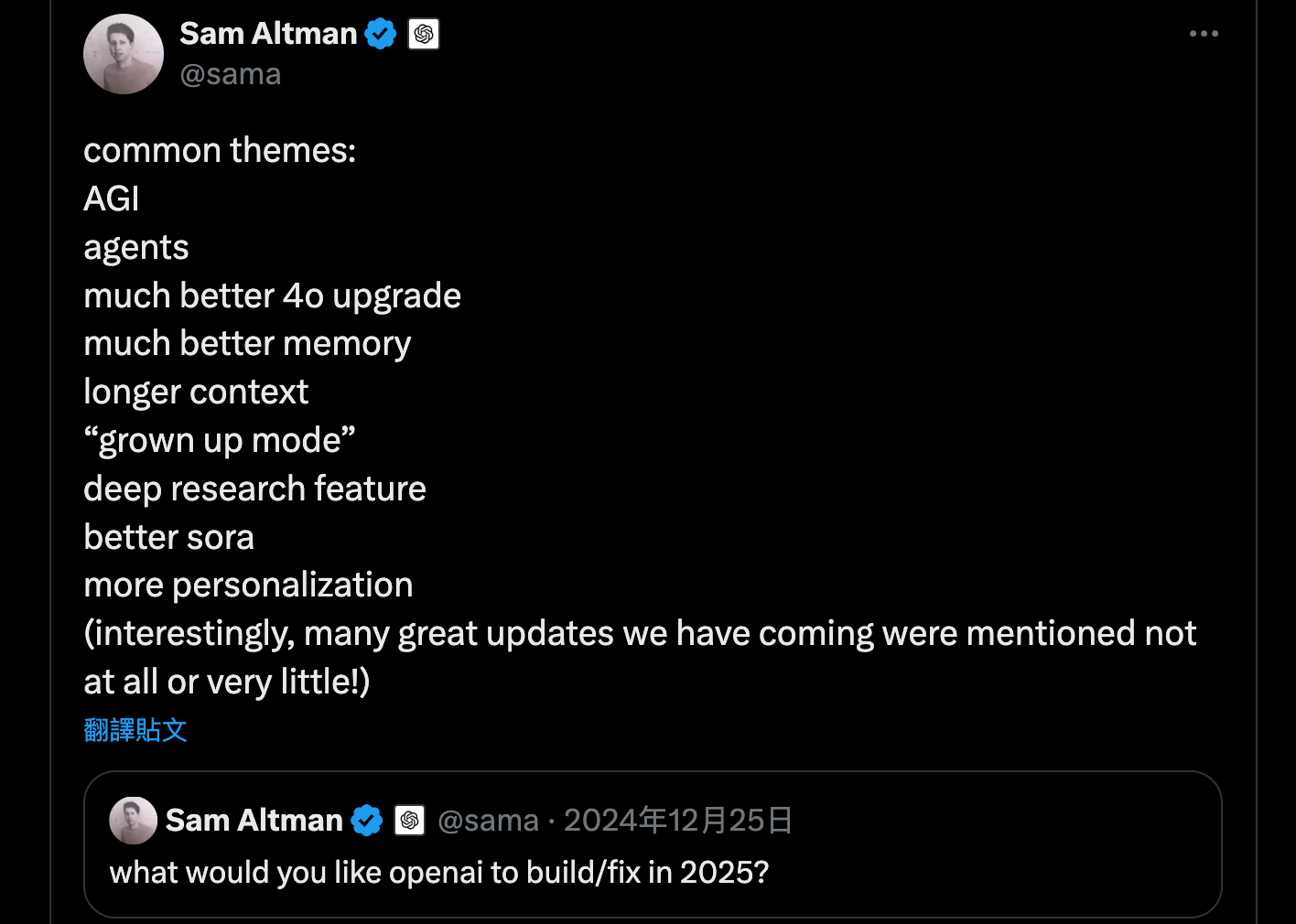 12/25(聖誕節耶!),在 X/Twitter 上回覆自己的發文問大家:最希望 OpenAI 在 2025 年建立/修復什麼?