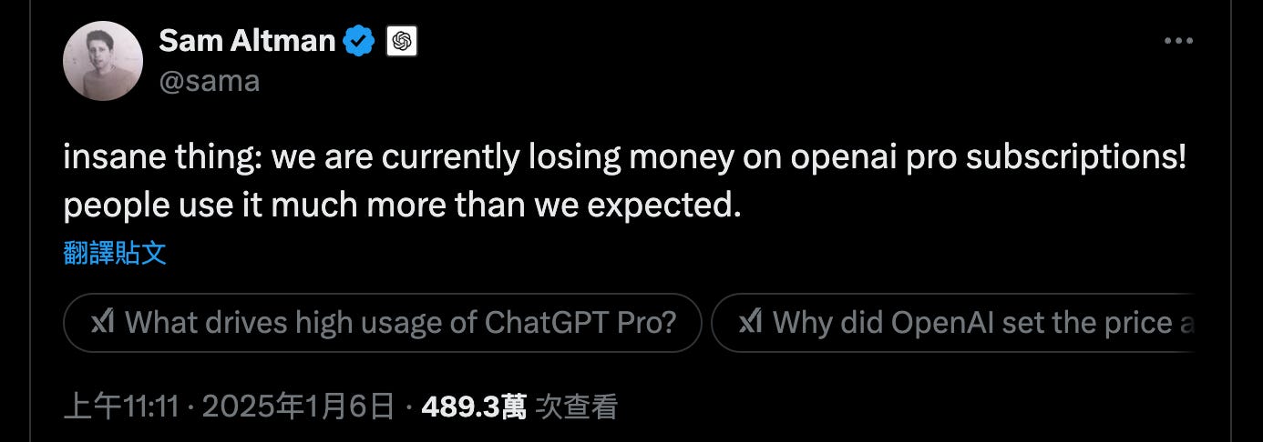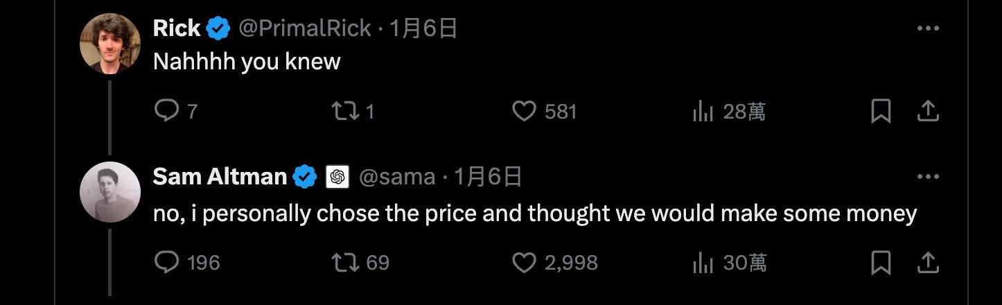 1/6,在 X/Twitter 上發文,「誠實」揭露:OpenAI Pro 在訂閱服務上正在賠錢,因為用戶使用量超乎預期。並也同樣「誠實」地回覆發文下方的問題:承認每月 200 美元的定價,是他的個人選擇,並以為會因此賺點錢。(稍微有在追蹤他的 X/Twitter,會發現他不時會很認真回覆發文下方的問題或觀點)